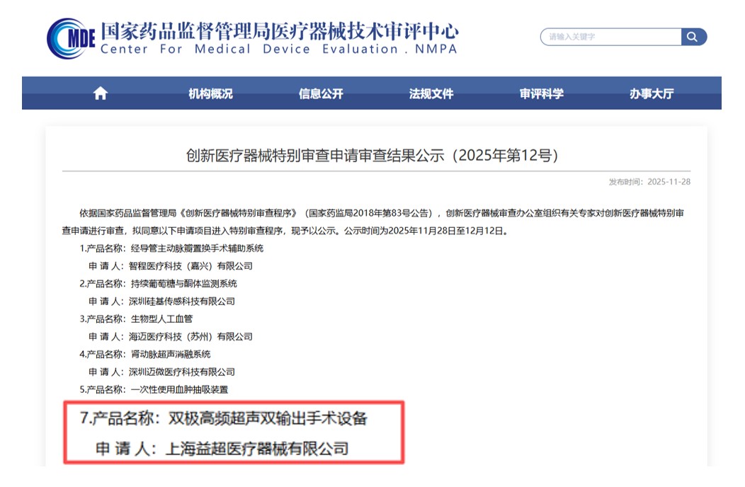 2025 年 11 月 28 日,上海益超医疗器械有限公司(益超医疗)自主研发的“双极高频超声双输出手术设备”成功通过国家药品监督管理局(NMPA)创新医疗器械特别审查。这是该产品继2022年获得国家重点研发计划立项后,斩获的又一国家级权威认可,不仅标志着该设备正式迈入上市加速通道,更意味该设备在技术、临床以及市场上处于行业领先。目前该产品已经进入临床试验。